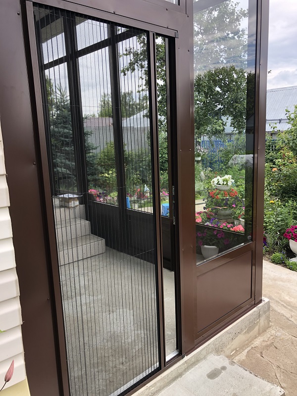 В этом случае одним из лучших решений было бы использование новинки - раздвижной плессированной москитной сетки (плиссе). Она легко монтируется на раму двери, легким движением складывается в одну сторону, и также легко закрывается. Такую москитную сетку можно оставлять сложенной на зимний период и ее не откроет ветром.
